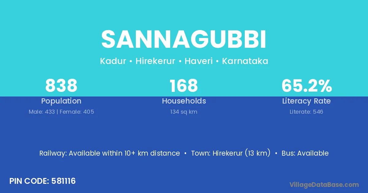 Hirekerur (13 km) is the nearest town to Sannagubbi village for major economic activities and is located approximately 13 km away.