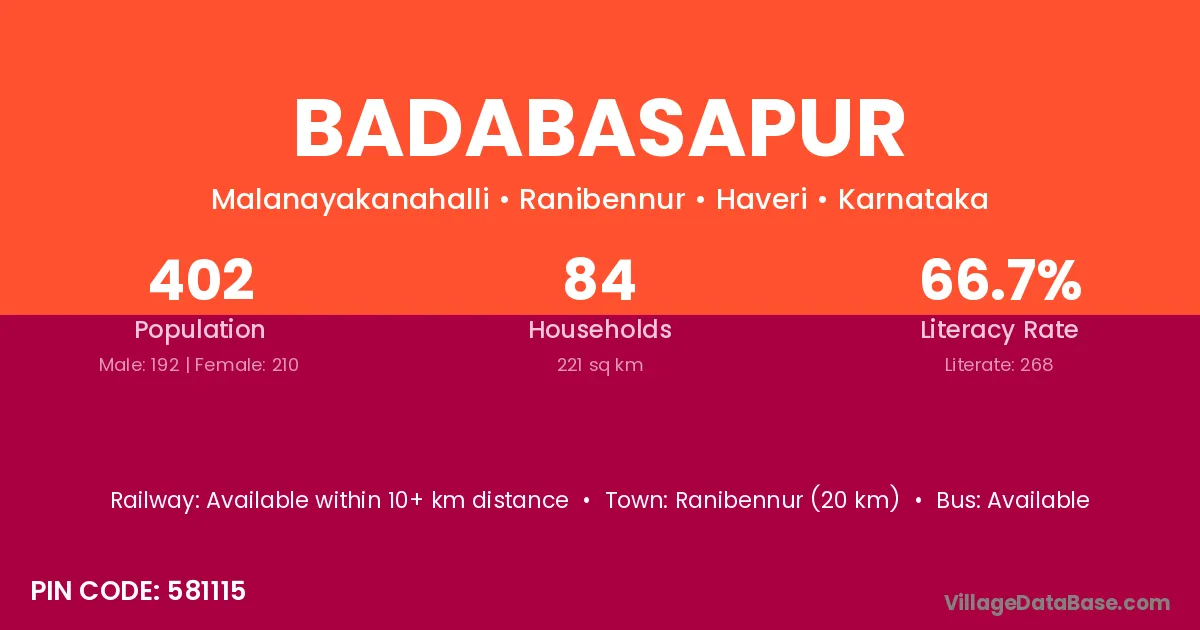 Ranibennur (20 km) is the nearest town to Badabasapur village for major economic activities and is located approximately 20 km away.