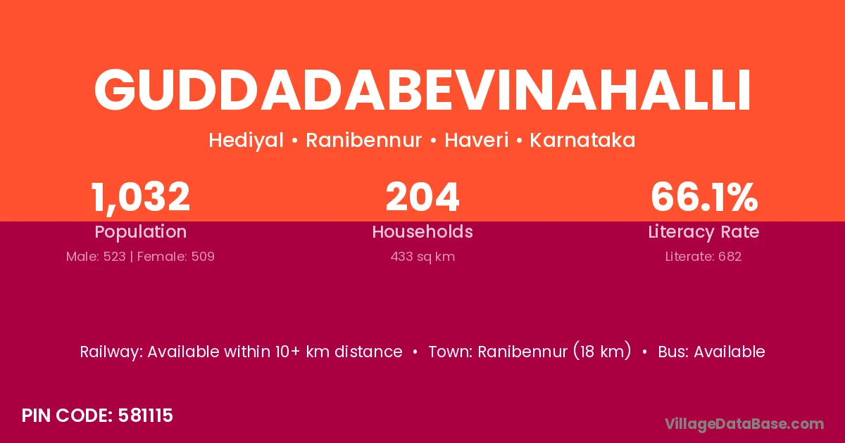 Ranibennur (18 km) is the nearest town to Guddadabevinahalli village for major economic activities and is located approximately 18 km away.