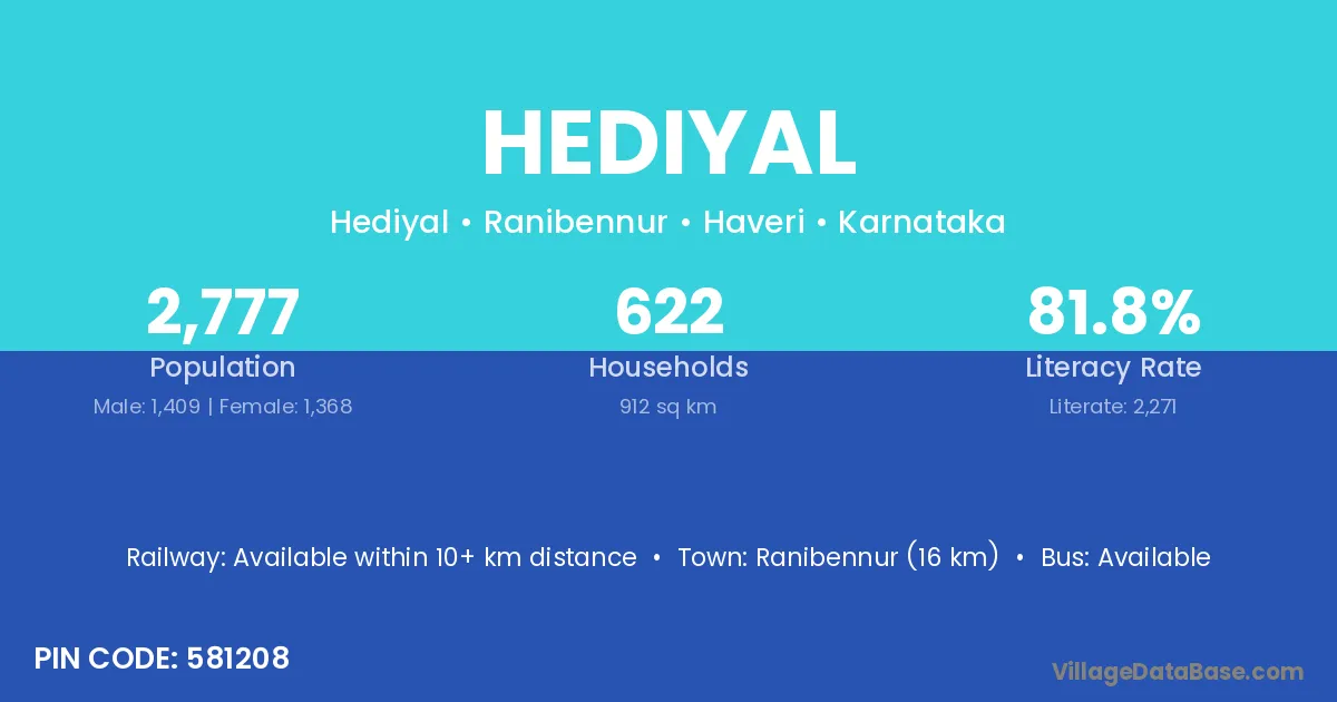 Ranibennur (16 km) is the nearest town to Hediyal village for major economic activities and is located approximately 16 km away.