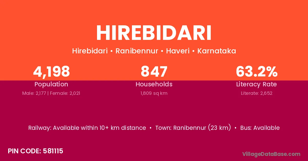 Ranibennur (23 km) is the nearest town to Hirebidari village for major economic activities and is located approximately 23 km away.