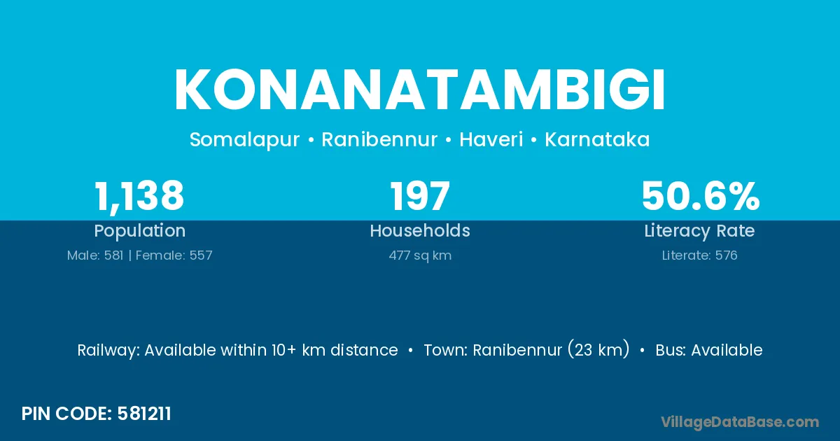 Ranibennur (23 km) is the nearest town to Konanatambigi village for major economic activities and is located approximately 23 km away.