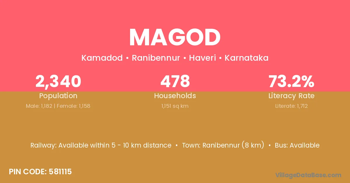 Ranibennur (8 km) is the nearest town to Magod village for major economic activities and is located approximately 8 km away.