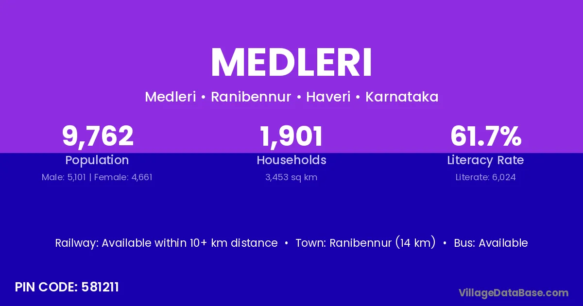 Ranibennur (14 km) is the nearest town to Medleri village for major economic activities and is located approximately 14 km away.