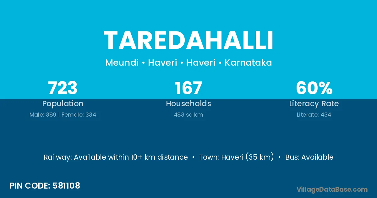Ranibennur (15 km) is the nearest town to Taredahalli village for major economic activities and is located approximately 15 km away.