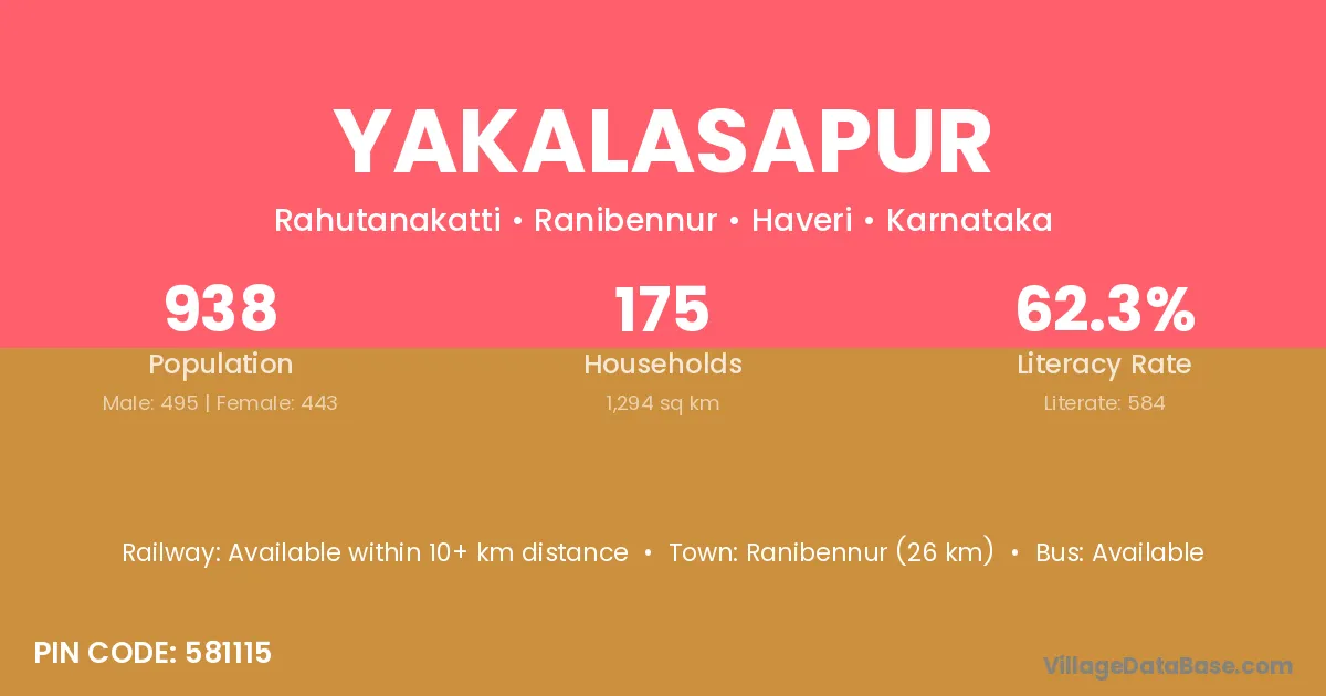 Ranibennur (26 km) is the nearest town to Yakalasapur village for major economic activities and is located approximately 26 km away.