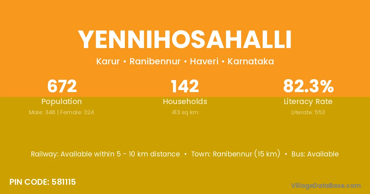 Ranibennur (15 km) is the nearest town to Yennihosahalli village for major economic activities and is located approximately 15 km away.