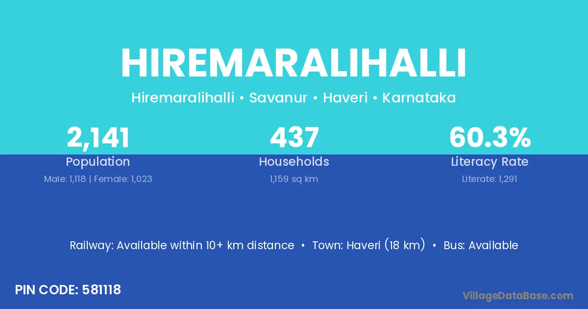 Haveri (18 km) is the nearest town to Hiremaralihalli village for major economic activities and is located approximately 18 km away.