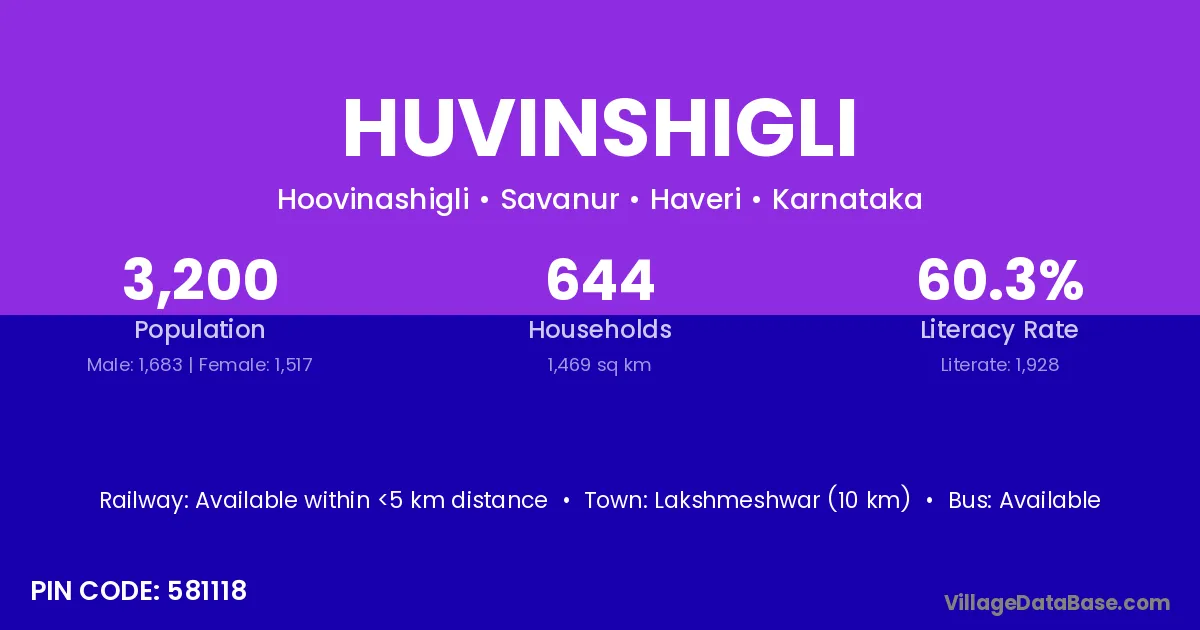Lakshmeshwar (10 km) is the nearest town to Huvinshigli village for major economic activities and is located approximately 10 km away.
