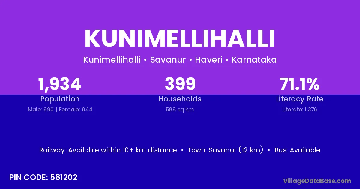 Savanur (12 km) is the nearest town to Kunimellihalli village for major economic activities and is located approximately 12 km away.