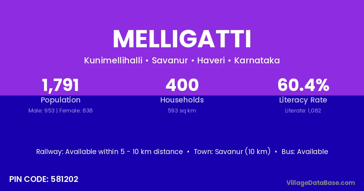 Savanur (10 km) is the nearest town to Melligatti village for major economic activities and is located approximately 10 km away.