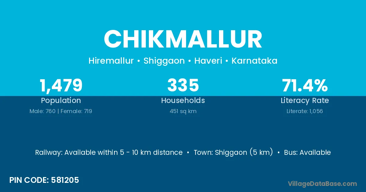 Shiggaon (5 km) is the nearest town to Chikmallur village for major economic activities and is located approximately 5 km away.
