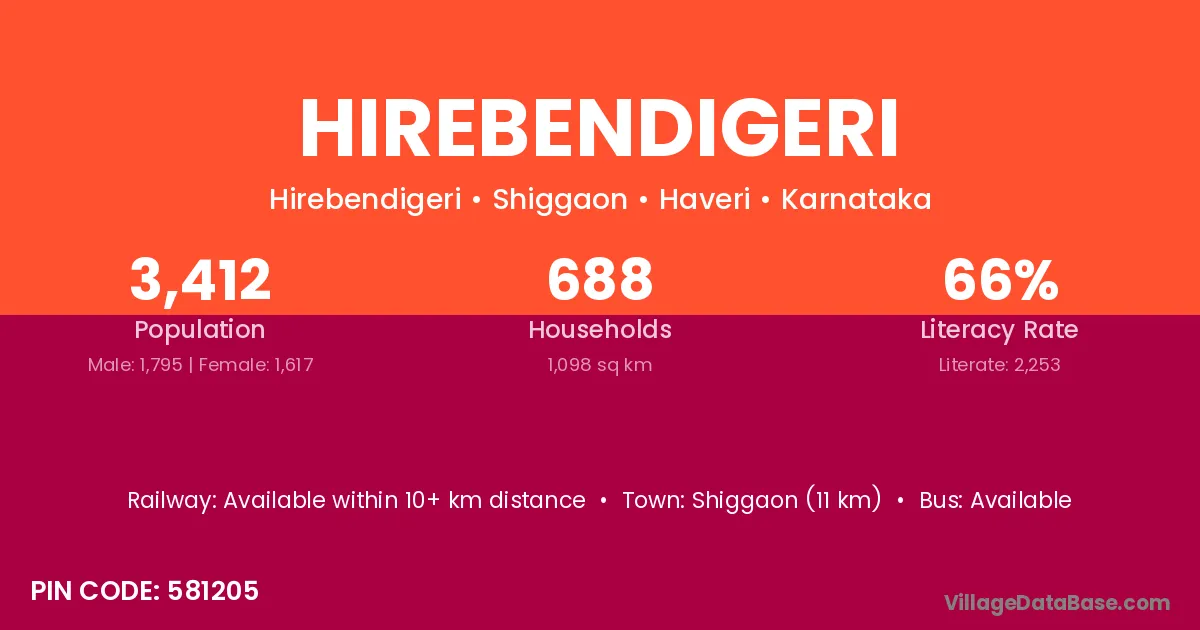 Shiggaon (11 km) is the nearest town to Hirebendigeri village for major economic activities and is located approximately 11 km away.