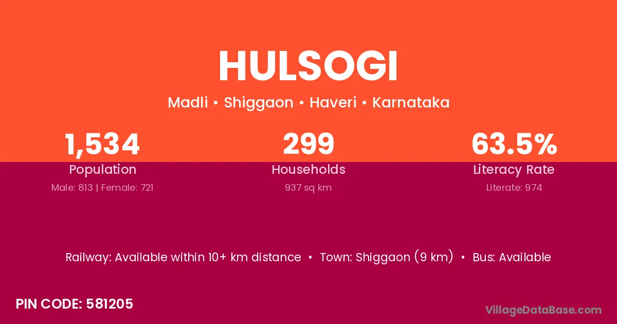 Shiggaon (9 km) is the nearest town to Hulsogi village for major economic activities and is located approximately 9 km away.