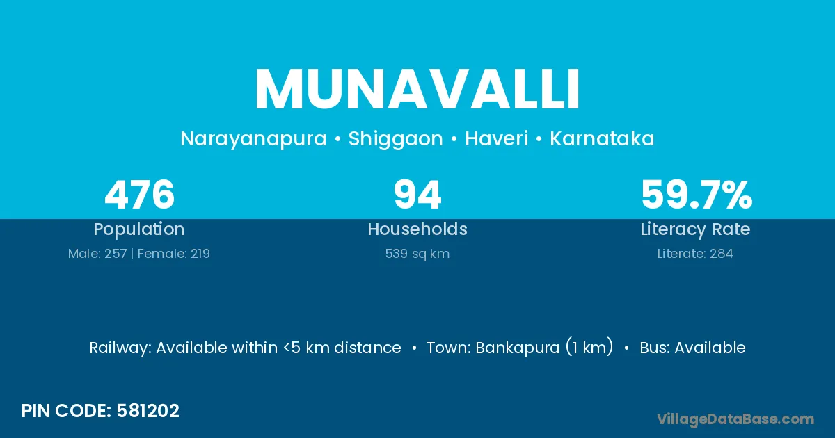 Bankapura (1 km) is the nearest town to Munavalli village for major economic activities and is located approximately 1 km away.