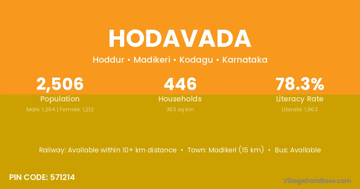 Madikeri (15 km) is the nearest town to Hodavada village for major economic activities and is located approximately 15 km away.