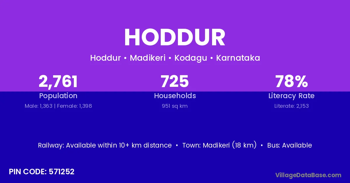 Madikeri (18 km) is the nearest town to Hoddur village for major economic activities and is located approximately 18 km away.