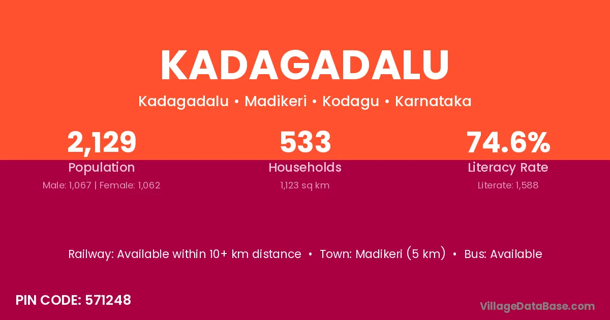 Kadagadalu village has a total population of 2,129 people, of which 1,067 are males and 1,062 are females.