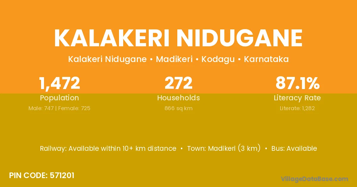 Madikeri (3 km) is the nearest town to Kalakeri Nidugane village for major economic activities and is located approximately 3 km away.