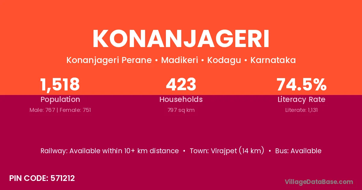 Virajpet (14 km) is the nearest town to Konanjageri village for major economic activities and is located approximately 14 km away.