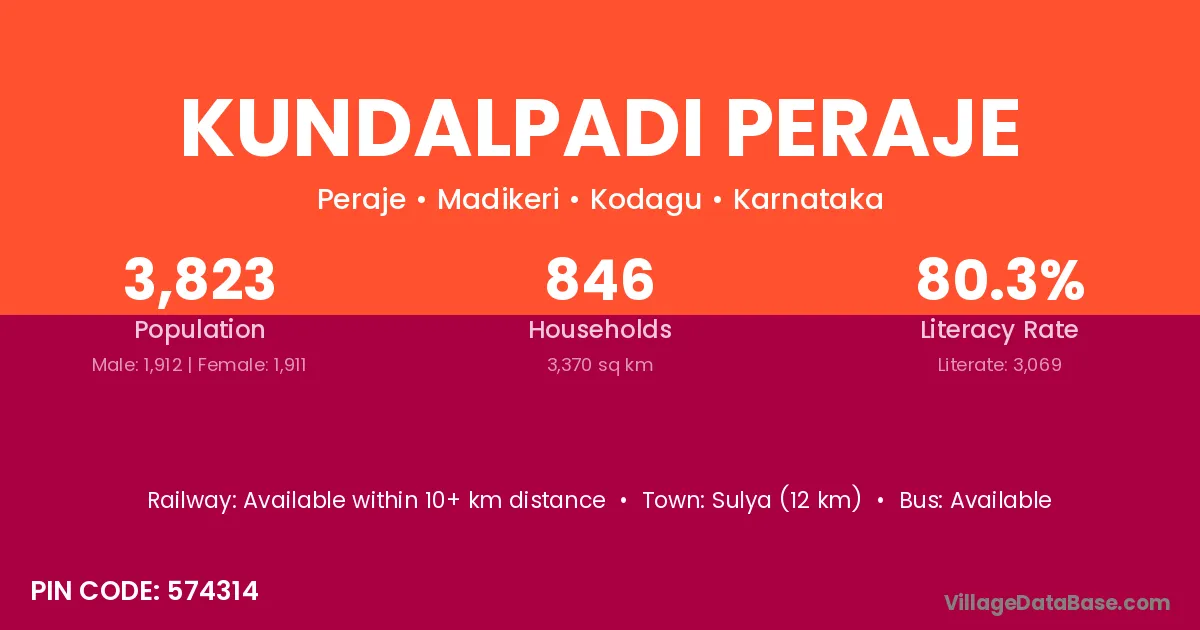 Kundalpadi Peraje village has a total population of 3,823 people, of which 1,912 are males and 1,911 are females.