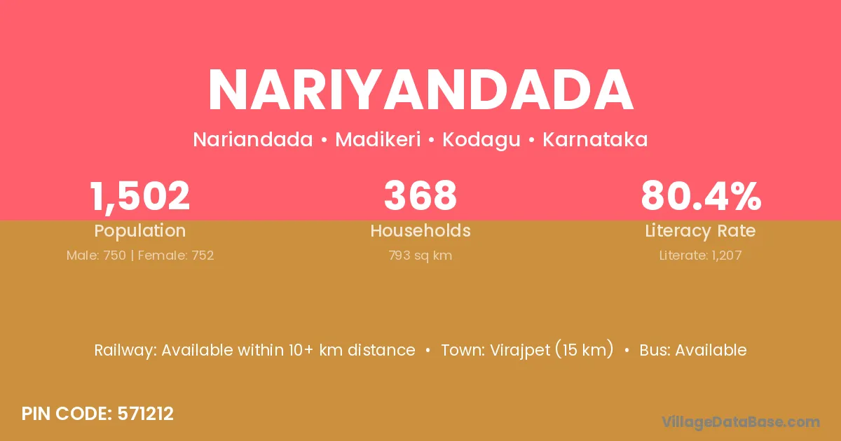 Virajpet (15 km) is the nearest town to Nariyandada village for major economic activities and is located approximately 15 km away.