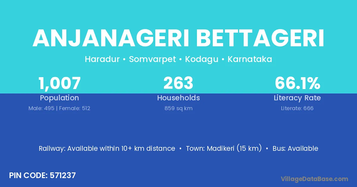 Madikeri (15 km) is the nearest town to Anjanageri Bettageri village for major economic activities and is located approximately 15 km away.