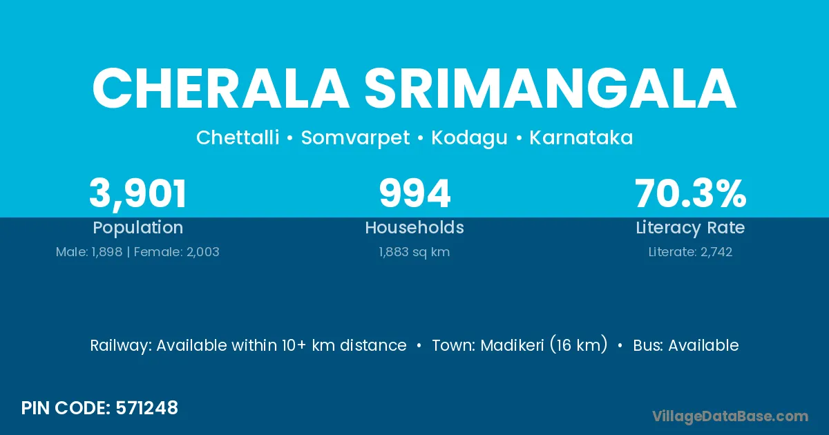 Madikeri (16 km) is the nearest town to Cherala Srimangala village for major economic activities and is located approximately 16 km away.