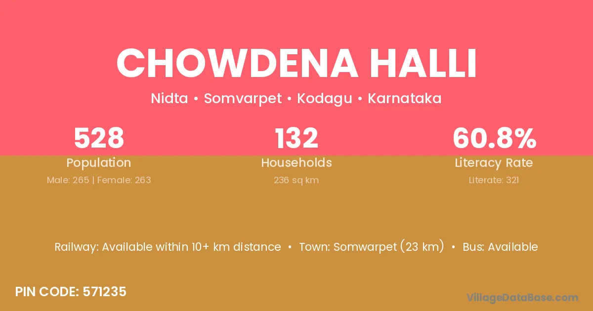 Somwarpet (23 km) is the nearest town to Chowdena Halli village for major economic activities and is located approximately 23 km away.