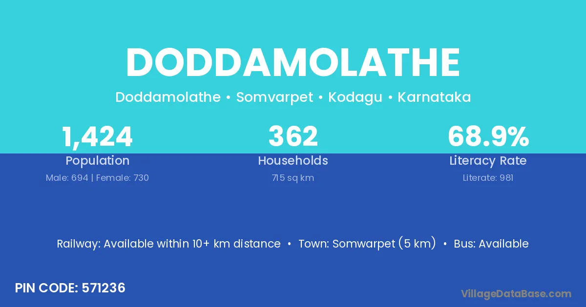 Somwarpet (5 km) is the nearest town to Doddamolathe village for major economic activities and is located approximately 5 km away.