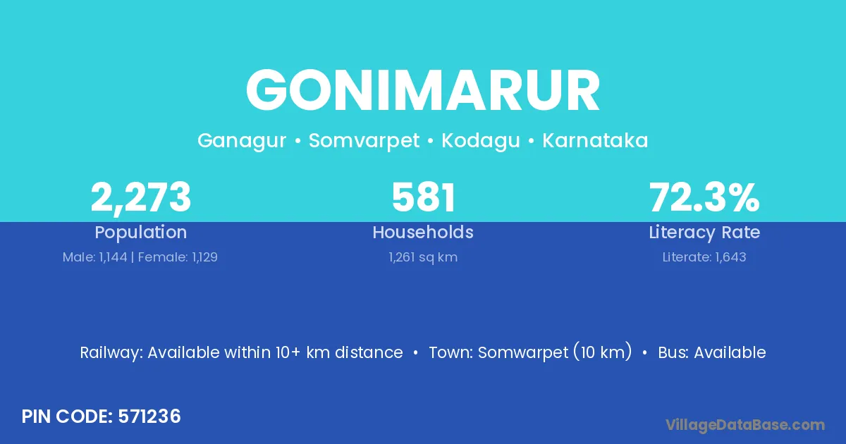 Somwarpet (10 km) is the nearest town to Gonimarur village for major economic activities and is located approximately 10 km away.