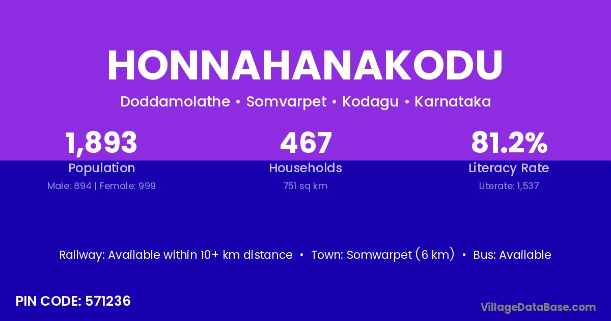 Somwarpet (6 km) is the nearest town to Honnahanakodu village for major economic activities and is located approximately 6 km away.