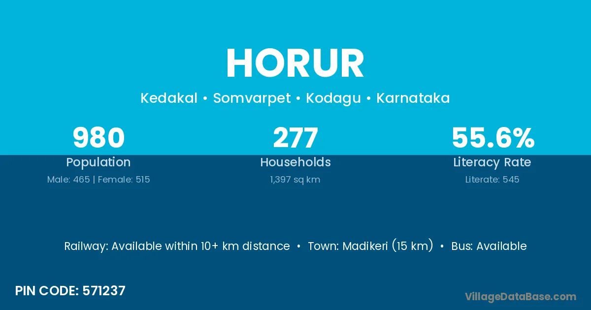 Madikeri (15 km) is the nearest town to Horur village for major economic activities and is located approximately 15 km away.