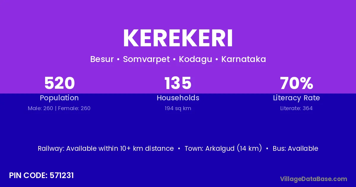 Arkalgud (14 km) is the nearest town to Kerekeri village for major economic activities and is located approximately 14 km away.