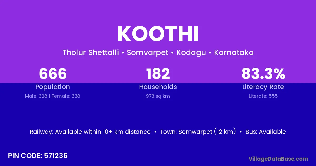 Somwarpet (12 km) is the nearest town to Koothi village for major economic activities and is located approximately 12 km away.