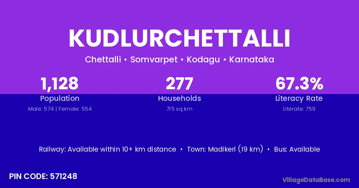 Madikeri (19 km) is the nearest town to Kudlurchettalli village for major economic activities and is located approximately 19 km away.
