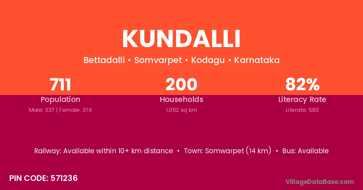 Somwarpet (14 km) is the nearest town to Kundalli village for major economic activities and is located approximately 14 km away.
