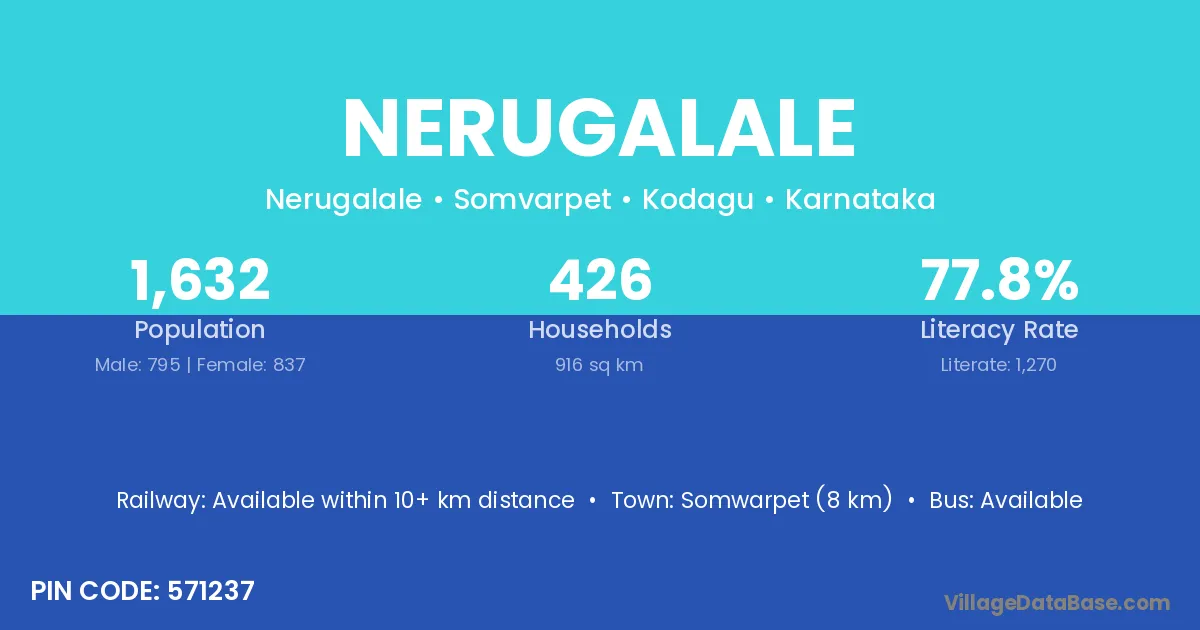 Somwarpet (8 km) is the nearest town to Nerugalale village for major economic activities and is located approximately 8 km away.