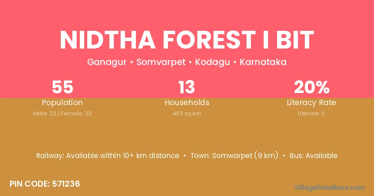 Somwarpet (9 km) is the nearest town to Nidtha Forest I Bit village for major economic activities and is located approximately 9 km away.