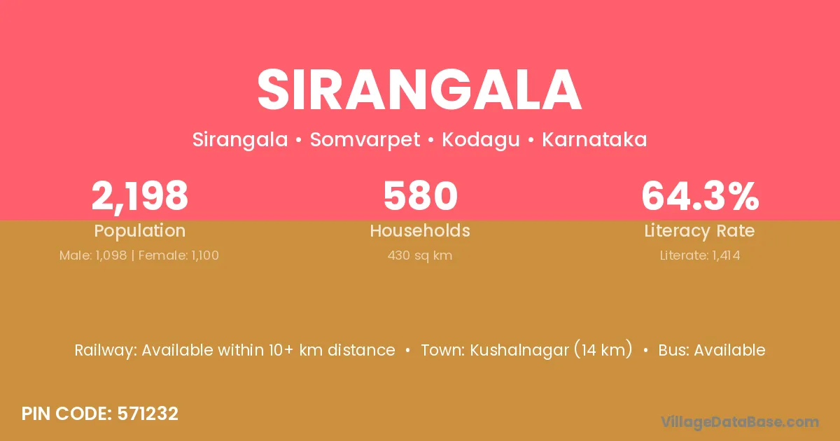 Kushalnagar (14 km) is the nearest town to Sirangala village for major economic activities and is located approximately 14 km away.