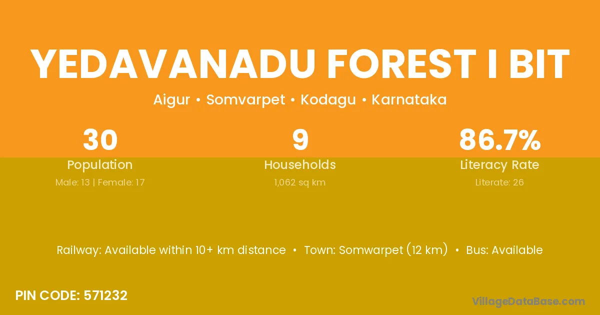 Yedavanadu Forest I Bit village has a total population of 30 people, of which 13 are males and 17 are females.