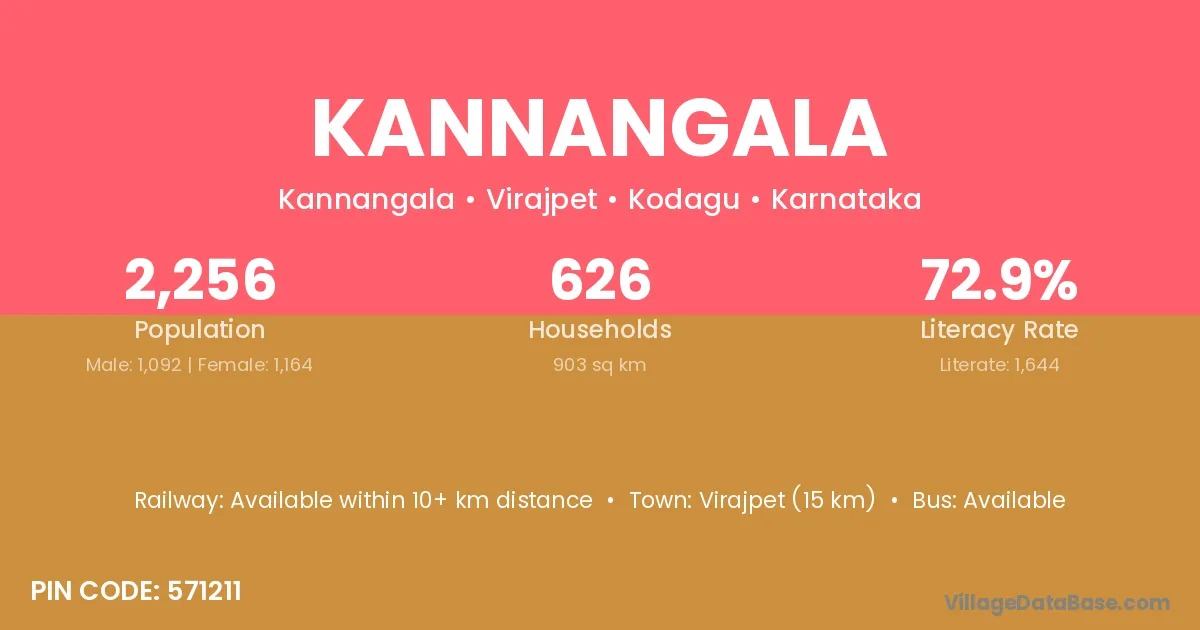 Virajpet (15 km) is the nearest town to Kannangala village for major economic activities and is located approximately 15 km away.