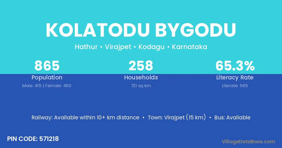 Virajpet (15 km) is the nearest town to Kolatodu Bygodu village for major economic activities and is located approximately 15 km away.