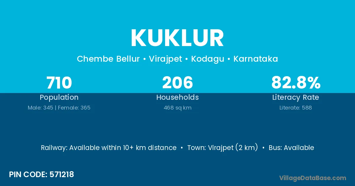Virajpet (2 km) is the nearest town to Kuklur village for major economic activities and is located approximately 2 km away.