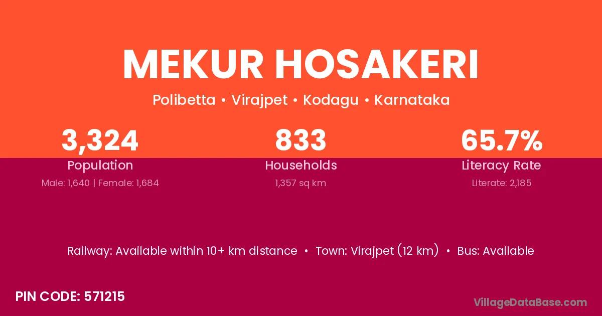 Virajpet (12 km) is the nearest town to Mekur Hosakeri village for major economic activities and is located approximately 12 km away.