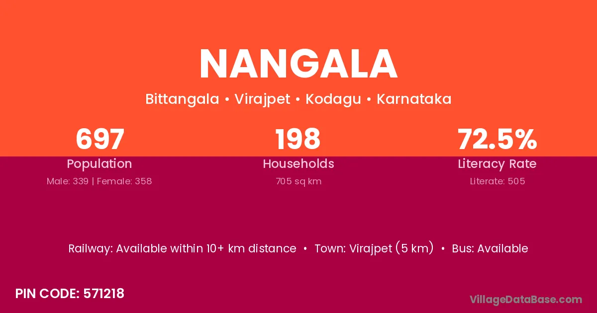 Virajpet (5 km) is the nearest town to Nangala village for major economic activities and is located approximately 5 km away.