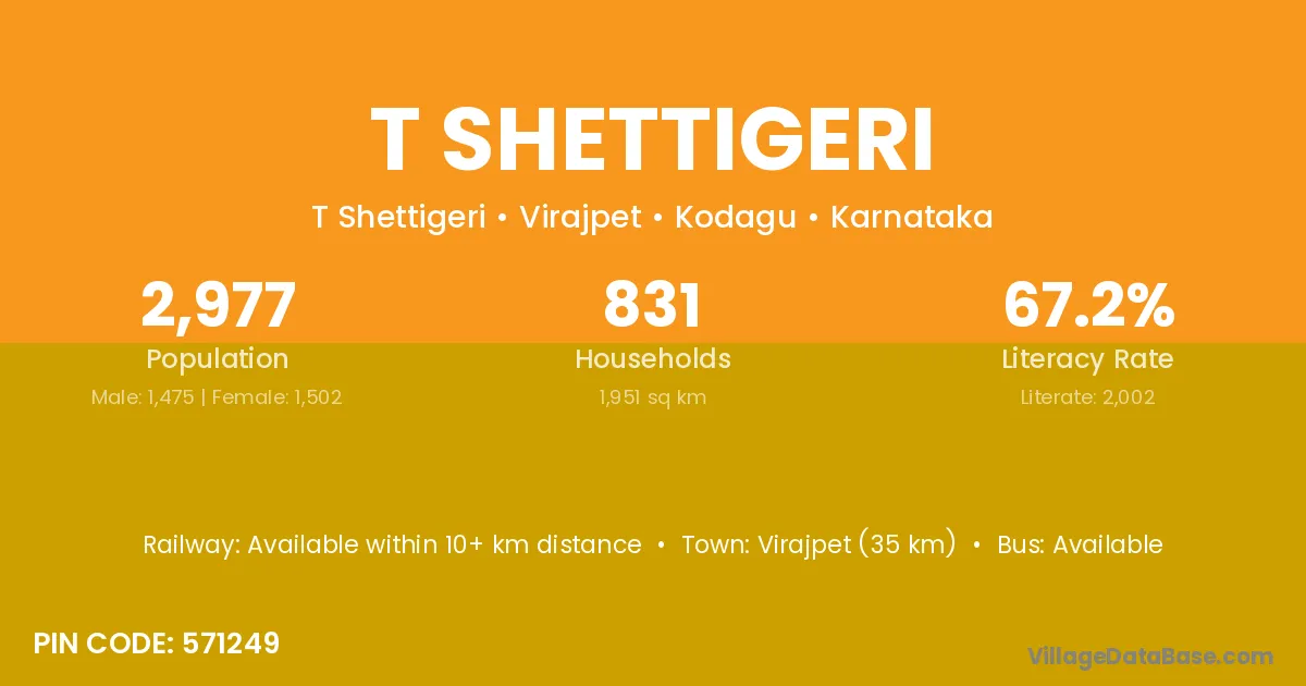 Virajpet (35 km) is the nearest town to T Shettigeri village for major economic activities and is located approximately 35 km away.