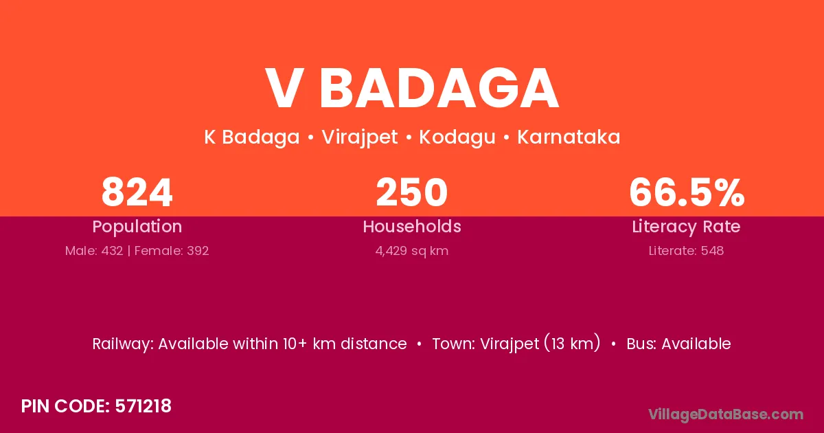 Virajpet (13 km) is the nearest town to V Badaga village for major economic activities and is located approximately 13 km away.