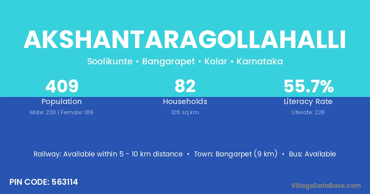 Bangarpet (9 km) is the nearest town to Akshantaragollahalli village for major economic activities and is located approximately 9 km away.