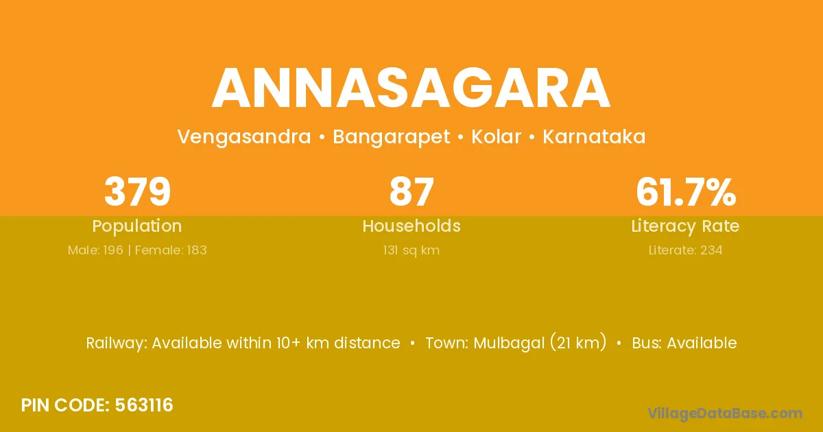 Mulbagal (21 km) is the nearest town to Annasagara village for major economic activities and is located approximately 21 km away.